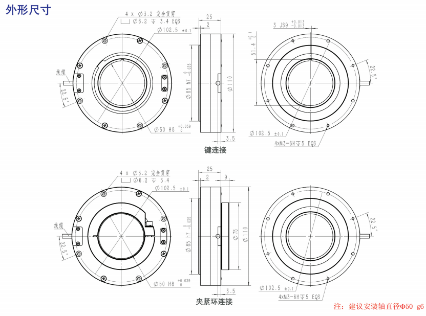 :外徑100mm、內徑50mm,夾緊環 /鍵連接方式 高精度角度傳感器、空心角位移開關,檢測范圍0~360°,最高精度可達0.002°,分辨率20bit,多輸出可選